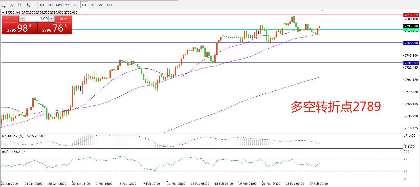 4小时图看,SP500高位震荡后呈现上升趋势,21均线成为下方短线支撑,MACD红柱减少,RSI指标掉头向上,短期有回调风险,但整体依然维持多头思路。