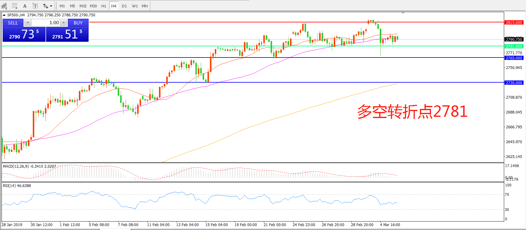 4小时图看,标普500长阴下破均线支撑后震荡反弹,涨势放缓,但整体仍在上升间内MACD红柱减少,RSI指标走平,重点关注2781一线支撑。