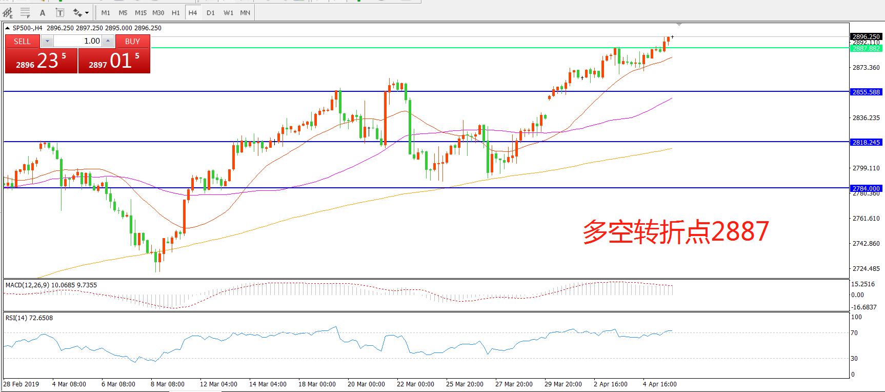 4小时图看,标普500突破2855后震荡反弹,突破上方阻力2887后持续上行,均线系统呈现多头排列, MACD红柱增加,RSI指标走平,日内走势震荡偏多。