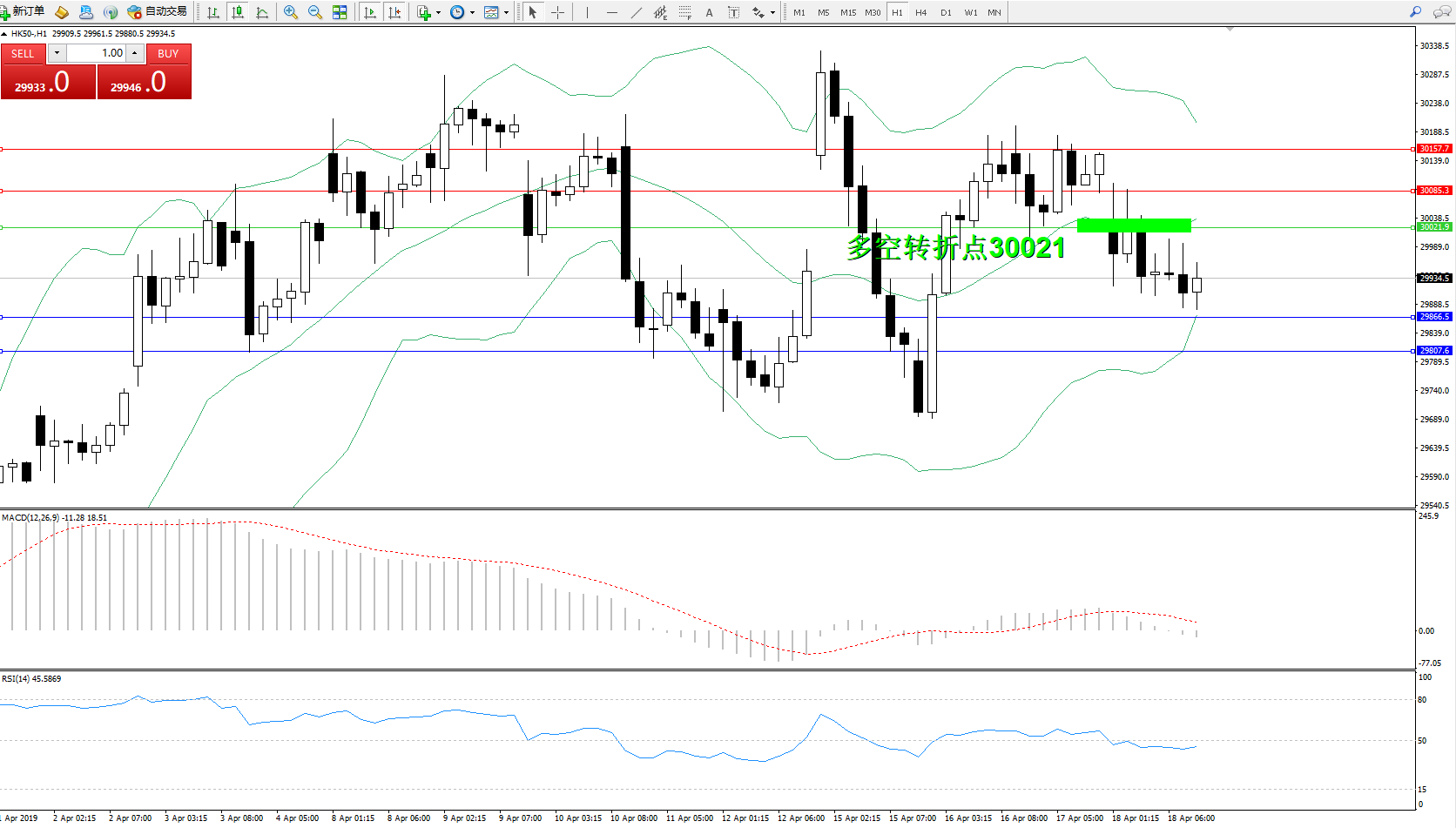 港股早上低开,曾收窄至仅跌22点。唯沽盘涌现,再扩大跌幅,穿30000关口,低见29927,最多跌196点。香港恒生指数收盘跌0.5%29963.26点。美联储昨日公布褐皮书认为就业市场较为良好,市场对此解读不一,美股医药及制造业板块走弱拖累美三大股指收跌。现外围美股收跌令港股缺乏方向,同时美联储褐皮书的对就业说法令投资者认为偏鹰派,恒指走软。耶稣受难日,美国、澳大利亚、中国香港、欧洲多国(德英法西意等)交易所休市一日。