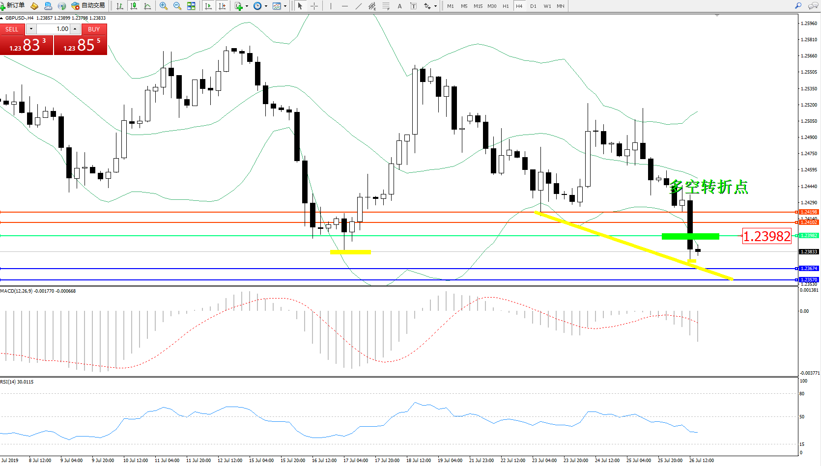 交易策略:1.23982下方看跌,目标1.23674、1.23570