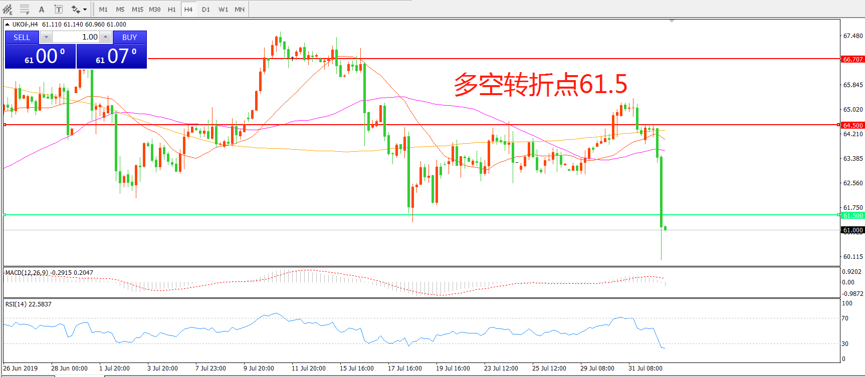 美联储议息会议的基调不及预期鸽派,市场认为美国不太可能实施漫长的宽松周期,8月1日,美国总统特朗普表示将对中国输美商品加征新一轮关税引发市场强烈担忧,贸易关系的不确定性让令原油需求面前景面临重大挑战, 布伦特原油暴跌7%,收报61.00美元/桶,为近七周来最低收盘价。