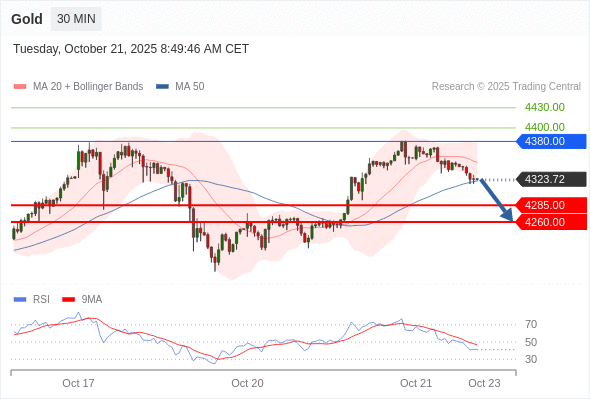 交易策略: 在 4380.00 之下,看跌,目标价位为 4285.00 ,然后为 4260.00 。