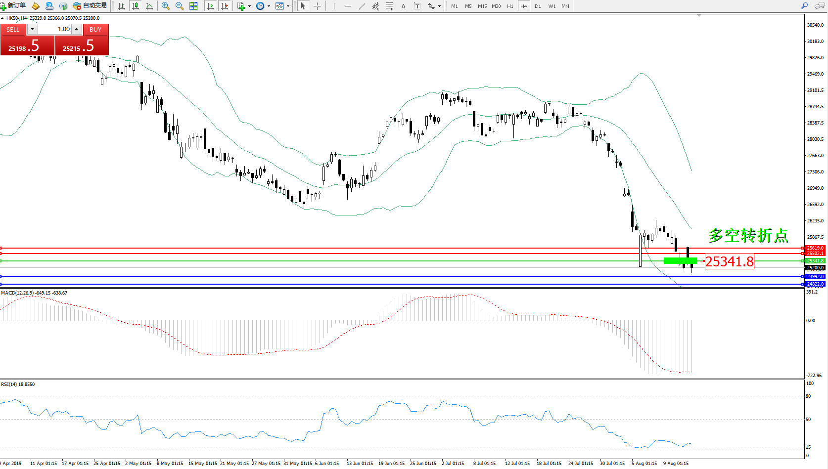 香港恒生指数814日(周三)收盘上涨20.98点,涨幅0.08%,报25302.28点;恒指夜期昨晚黄昏时候,曾急跌158点,低见25053。随后跟美股造好而反弹,再急升超过694点,全晚高低波幅852点,为近期少见。早上跟随高开后,再小幅向上,最多升436点,恒指高见25717。虽然隔晚贸易关系又似出现转机,但过去一年多以来相关情况已见惯见熟。而在内忧外患下,恒指下跌趋势实在所难免。市场应维持后市悲观看法不变。