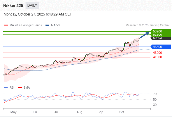 在 46500 之上,看涨,目标价位为 51800 ,然后为 53200 。