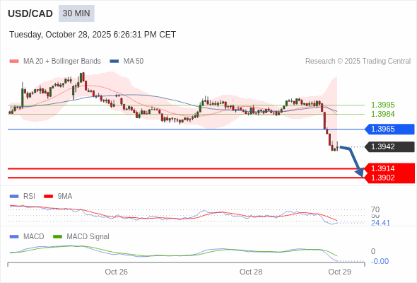 技术点评: RSI技术指标小于30。在这种情况下,说明有很强的下跌趋势,或者意味着处在超卖的状态下,可能会有向上的反弹。我们将观察RSI技术指标是否出现背离现象。 MACD技术指标处在其信号线之下看空。 配置为负。 此外,价位低于其20天及50天移动平均线 ( 分别位于1.3983 和1.3988 )。