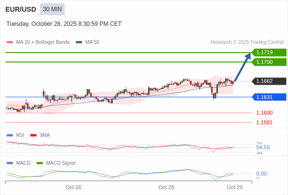 欧元/美元 当日内 : 看涨,当 1.1631 为支撑位。