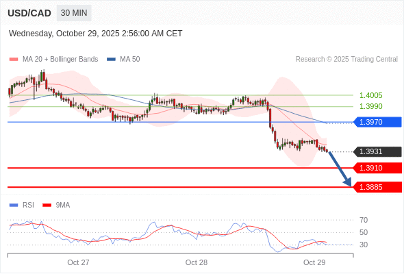 在 1.3970 之下,看跌,目标价位为 1.3910 ,然后为 1.3885 。
