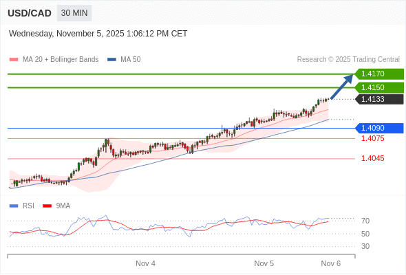 在 1.4090 之上,看涨,目标价位为 1.4150 ,然后为 1.4170 。