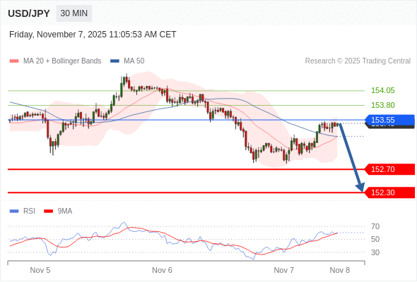 在 153.55 之下,看跌,目标价位为 152.70 ,然后为 152.30 。