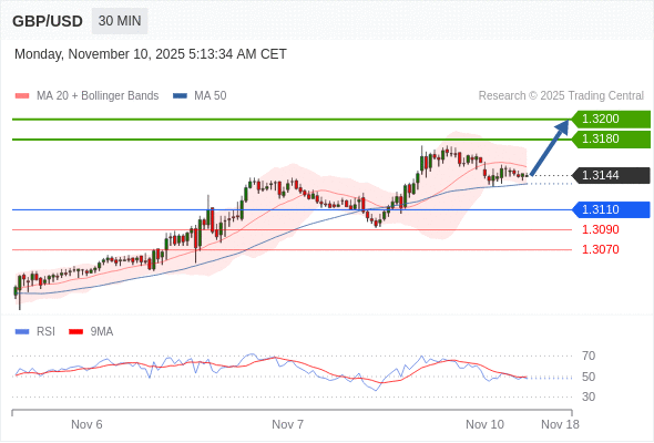 在 1.3110 之上,看涨,目标价位为 1.3180 ,然后为 1.3200 。