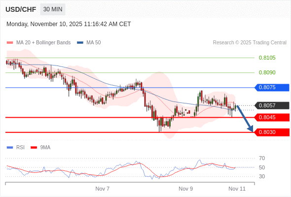 在 0.8075 之下,看跌,目标价位为 0.8045 ,然后为 0.8030 。