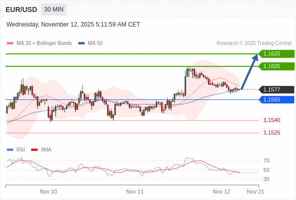 在 1.1565 之上,看涨,目标价位为 1.1605 ,然后为 1.1620 。