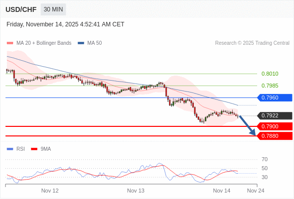 在 0.7960 之下,看跌,目标价位为 0.7900 ,然后为 0.7880 。