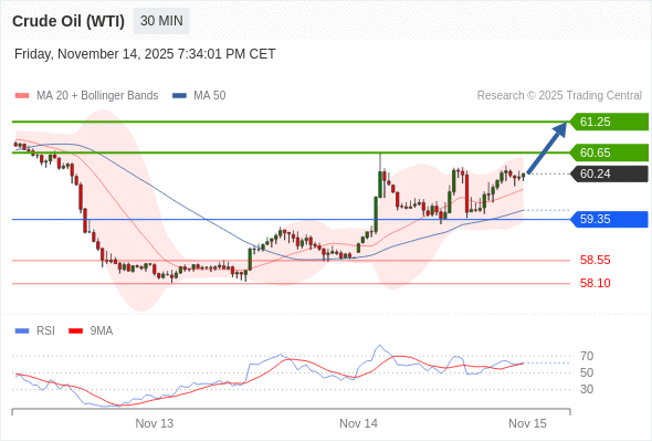 在 59.35 之上,看涨,目标价位为 60.65 ,然后为 61.25 。