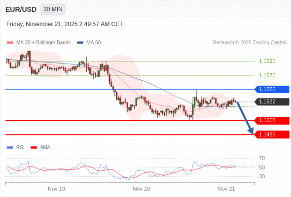 欧元/美元 当日内: 短期关键阻力位在1.1550。