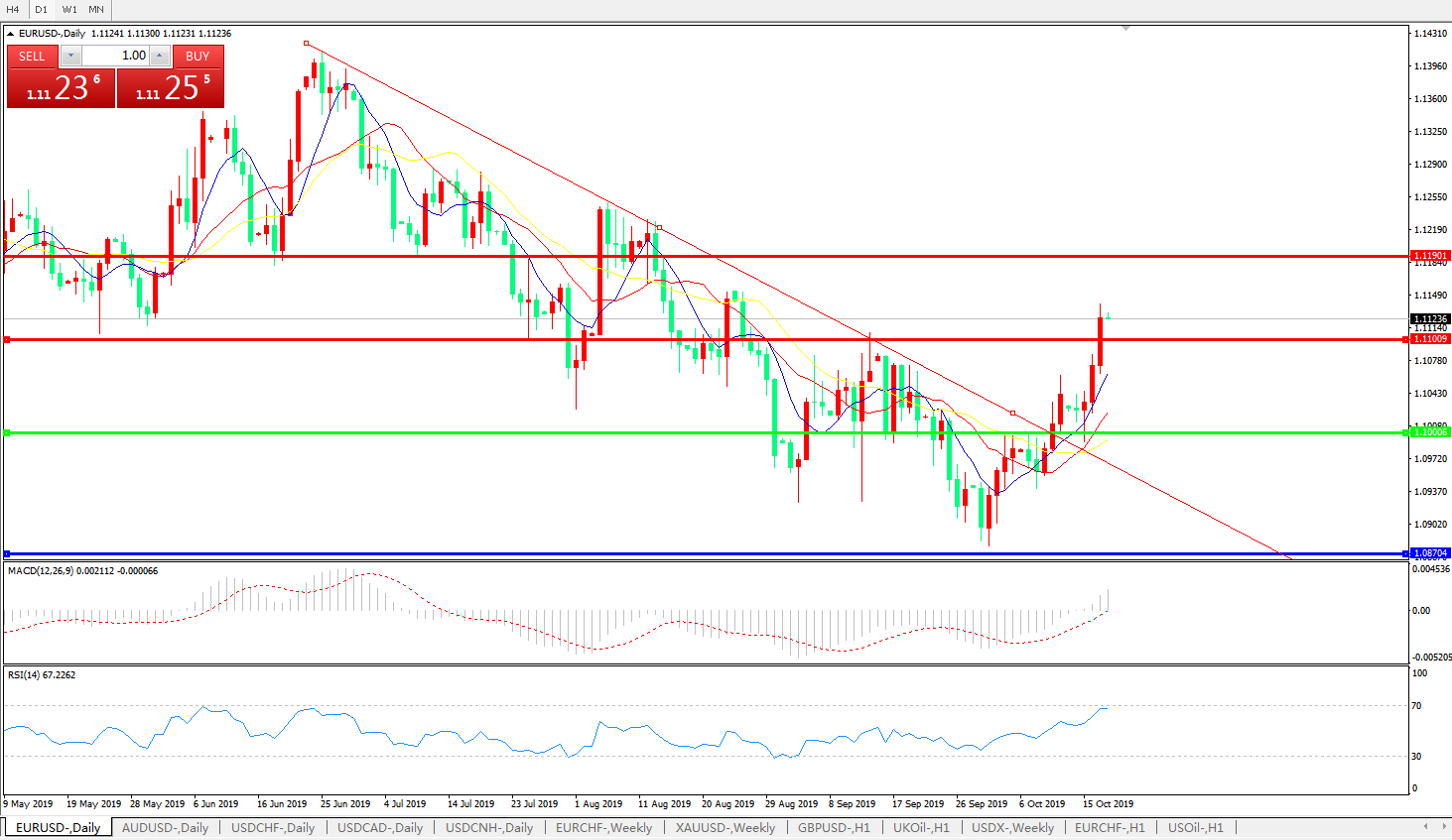 欧元兑美元在周四日内走高,升至1.1140这一近两个月来的新高,主要是受到了英国与欧盟顺利达成脱欧协议在即这一消息的拉动。而近一周以来,带动欧元汇价走势的主要动能,也来自于英镑汇价的连带强势; 上周以来,有关英国脱欧方面的整体向好的消息面状况推动者英镑兑美元在剧烈震荡中逐步走升,而如果能够及早化解脱欧问题的不确定性,也能令欧元区经济免受“硬脱欧”风险事件的打击。因此,欧元也跟随英镑一并走强,只是幅度不及后者; 而在欧元区自身缺乏消息事件引导的状况下,欧元最近一周也就成了英镑的“影子货币”,在日内英国脱欧协议在本国议会表决的前景再度堪忧导致英镑汇价回落后,欧元兑美元同样脱离高位,只是回落幅度同样不及英镑。考虑到此后直至月底,英国脱欧问题仍有众多变数,欧元走势跟随英镑的趋势仍将延续下去。