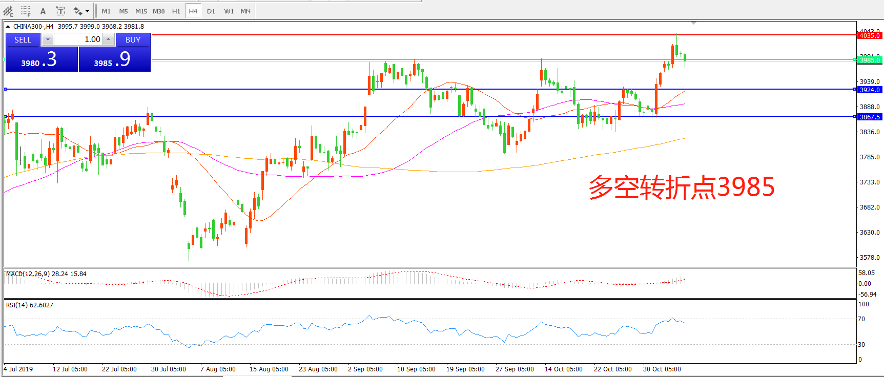 4小时图看,沪深300触碰4035阻力后小幅回落,但整体依然在3085支撑之上,整体走势偏多,均线系统有拐头迹象,MACD红柱增加,RSI指标向下,日内延续上行概率较大。