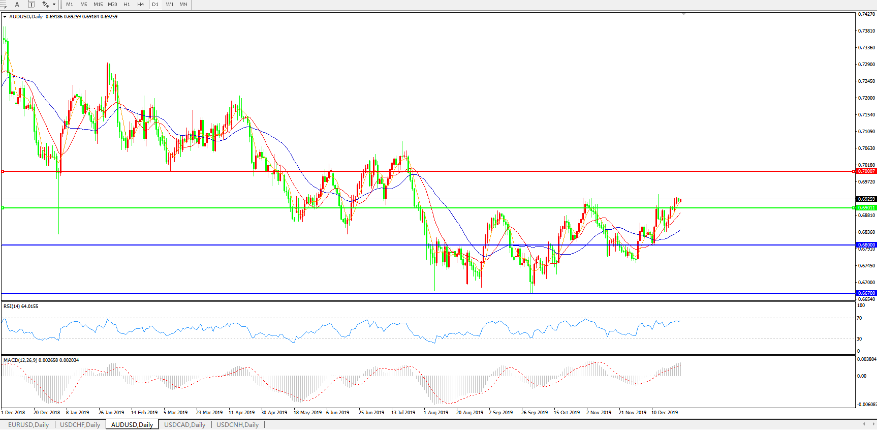 交易策略:0.6800上方看涨,目标0.6900、0.7000