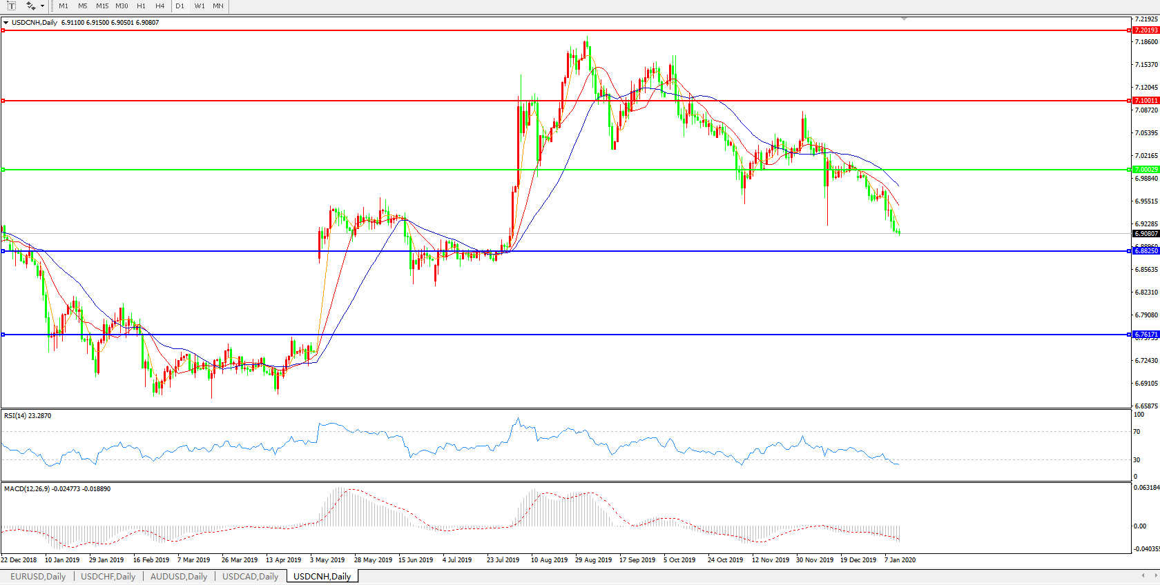 交易策略: 在7.0000之下,看跌,目标价位为6.8820,然后为6.7600。