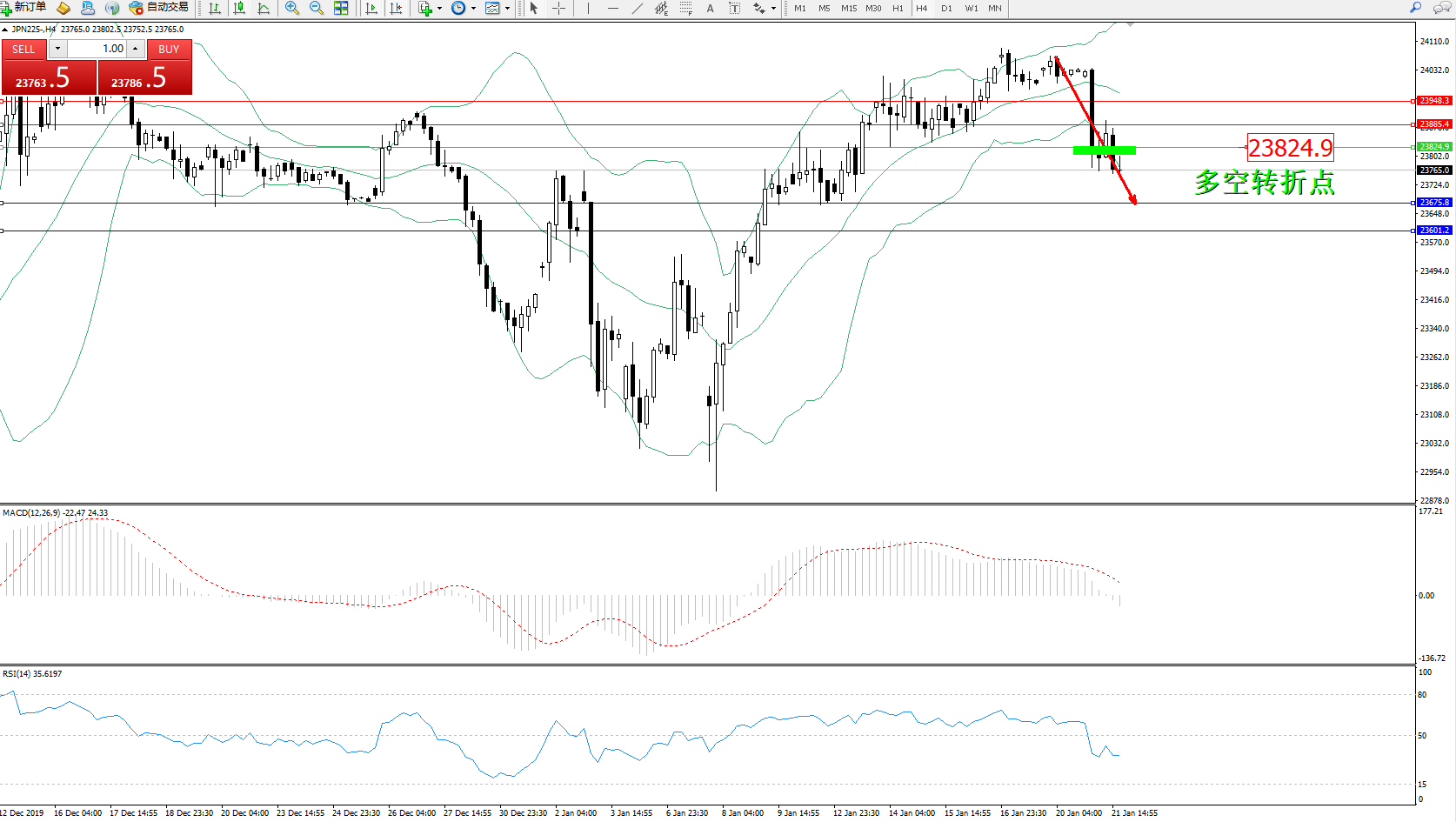 日经225指数121日(周二)收盘下跌234.01点,跌幅0.97%,报23849.50点。日本央行行长黑田东彦:日本经济正按照趋势温和扩张。至2021财年末,预计经济将保持扩张趋势。政府的经济刺激措施帮助提升日本GDP前景。下行风险主要来自海外因素。日本央行的通胀前景目标大体没有改变。物价保持上涨趋势,向2%的目标靠近。海外风险有所下降,但依旧高企。价格动能的风险值得关注。如果风险上升,将不会由于增加宽松措施。风险一旦实现将影响物价。中东地缘政治风险升高。来自于海外经济体的下行风险依旧较高。全球风险情绪的好转推动股市上涨。