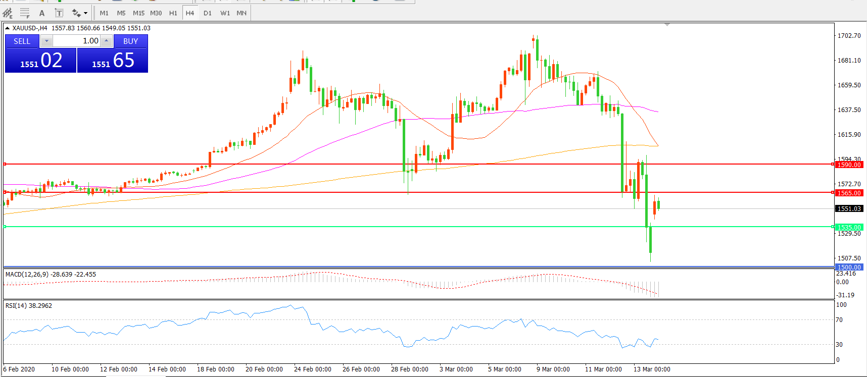 上周现货黄金完美的上演了“乐极生悲”的法则,在市场风雨飘摇之际,金价一度顶破1700关口,创2012年以来新高,但随着多头获利了结、股市大跌引发的保证金需求等因素影响,金价日线录得五连阴,累计下跌近200美元,收报1512.33美元/盎司,为1983年以来最大单周跌幅。