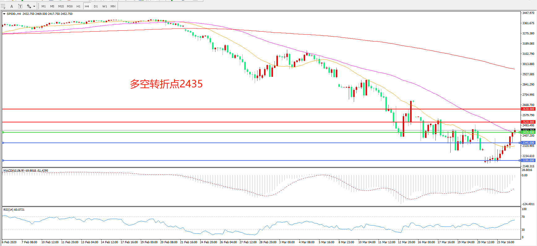 4小时图看,标普500阳线连续拉升,整体表现有止跌迹象,短期均线走平,MACD绿柱缩短,RSI指标向上,日内延续上行较大。
