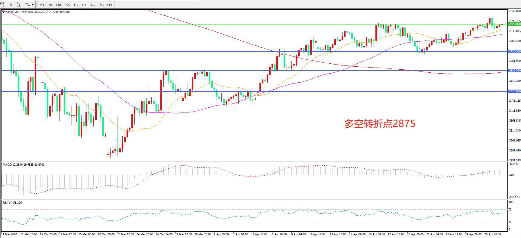 4小时图看,标普500高开低走, 整体仍然受制于2875阻力,均线系统粘合成为下方支撑,MACD红柱增加,RSI指标走平,日内震荡上行概率较大。