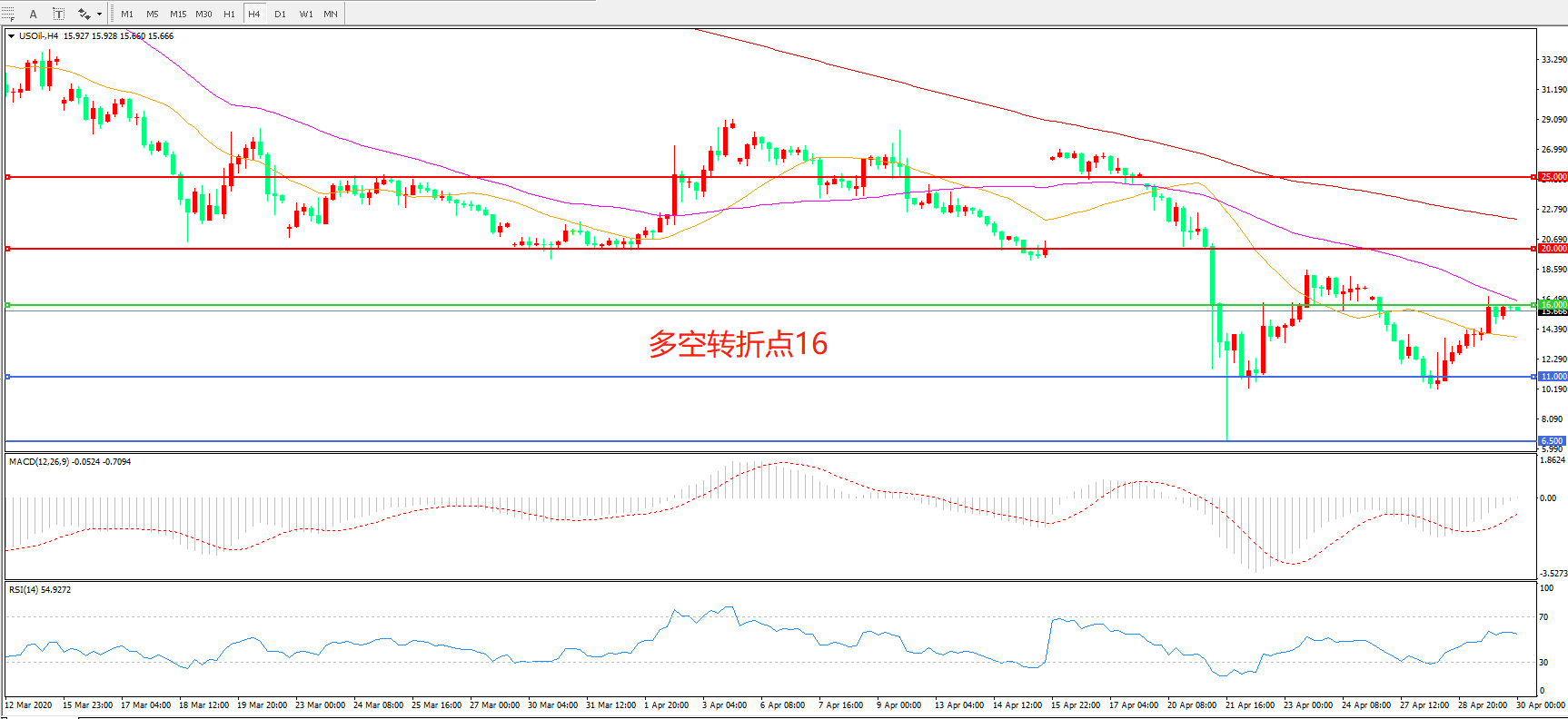 4小时图看,油价探底回升,整体走势有所回暖,16美元成为短期多空分水岭,均线系统仍呈空头排列,MACD绿柱缩短,RSI指标向上,日内延续震荡概率较大。