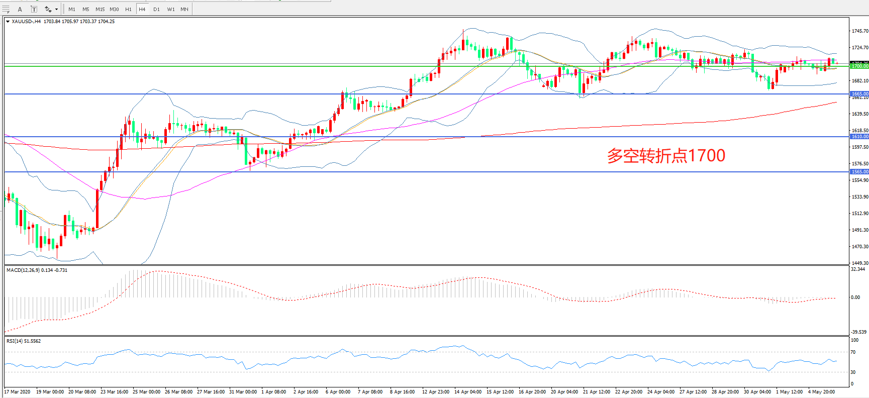 周二(5月5日),现货黄金继续围绕1700美元关口展开拉锯,美元指数连续三个交易日走强为金价带来了一定上行压力,但随着美联储重拾无限量宽松的措施以及经济下行的压力加大,金价中期支撑仍然稳固。