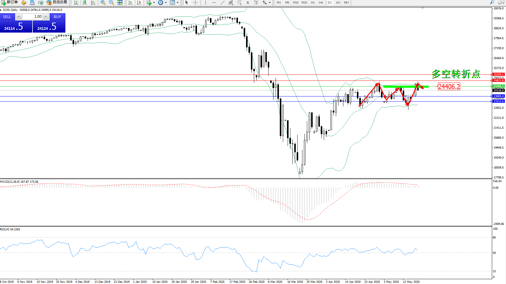 道琼斯指数5月19日(周二)收盘下跌390.50点,跌幅1.59%,报24206.86点。美股三大指数全线收跌,美国抗疫概念、能源板块走低。据报道Moderna的候选新冠疫苗没有产生足够多评估其成功与否的关键数据,关于该公司疫苗的消息是股市周一大涨的原因之一。将继续看到市场波动,因为市场每天都在把获取到的任何一丁点信息都反映到定价中,每天都在获取每一点信息并立即据此定价。现在其它一切都是新冠的衍生品。疫苗会成为改变格局的利好因素,股市也做出了相应的反应。