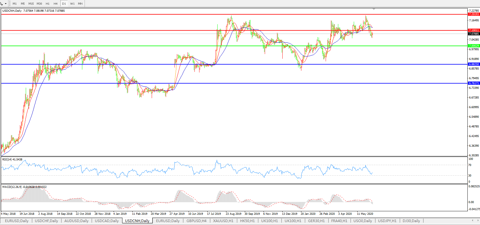 技术面简析:日图均线呈有序空头排列,汇价7.10关口下方窄幅整理,MACD开始走弱且量能0轴下放量,RSI小幅反弹,预计短期汇价或将进一步下行,关注7.00关口支撑。