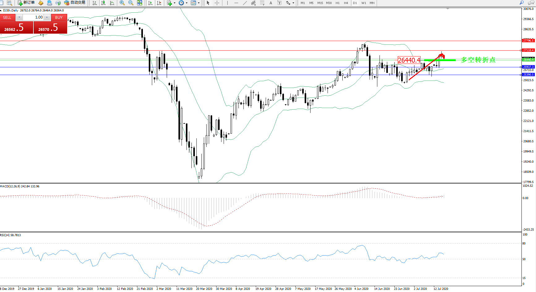 道琼斯指数716日(周四)收盘下跌135.50点,跌幅0.50%,报26734.64点。美股三大指数全部收跌,对冠状病毒感染人数上升的担忧引发普遍的避险操作,推动美国股市走低。冠状病毒感染再度激增迫使加州和其他州再次停摆,引发了对美国经济和劳动力市场将继续受到影响的担忧。科技股带动下三日来首次收跌,投资者撤出今年以来表现最好的板块,某些经济部门进展顺利,但现在的问题是已经看到第二波病例激增,而且一些州开始收紧政策,虽然预计不会是完全封锁,但无疑会让人怀疑复苏速度能有多快。美国商务部的报告显示,6月零售销售连续第二个月增长。但据美国劳工部周四发布的另一份报告,新冠疫情再度加重,正在削弱刚刚开始的复苏,仍有3,200万美国人在领取失业救济金。