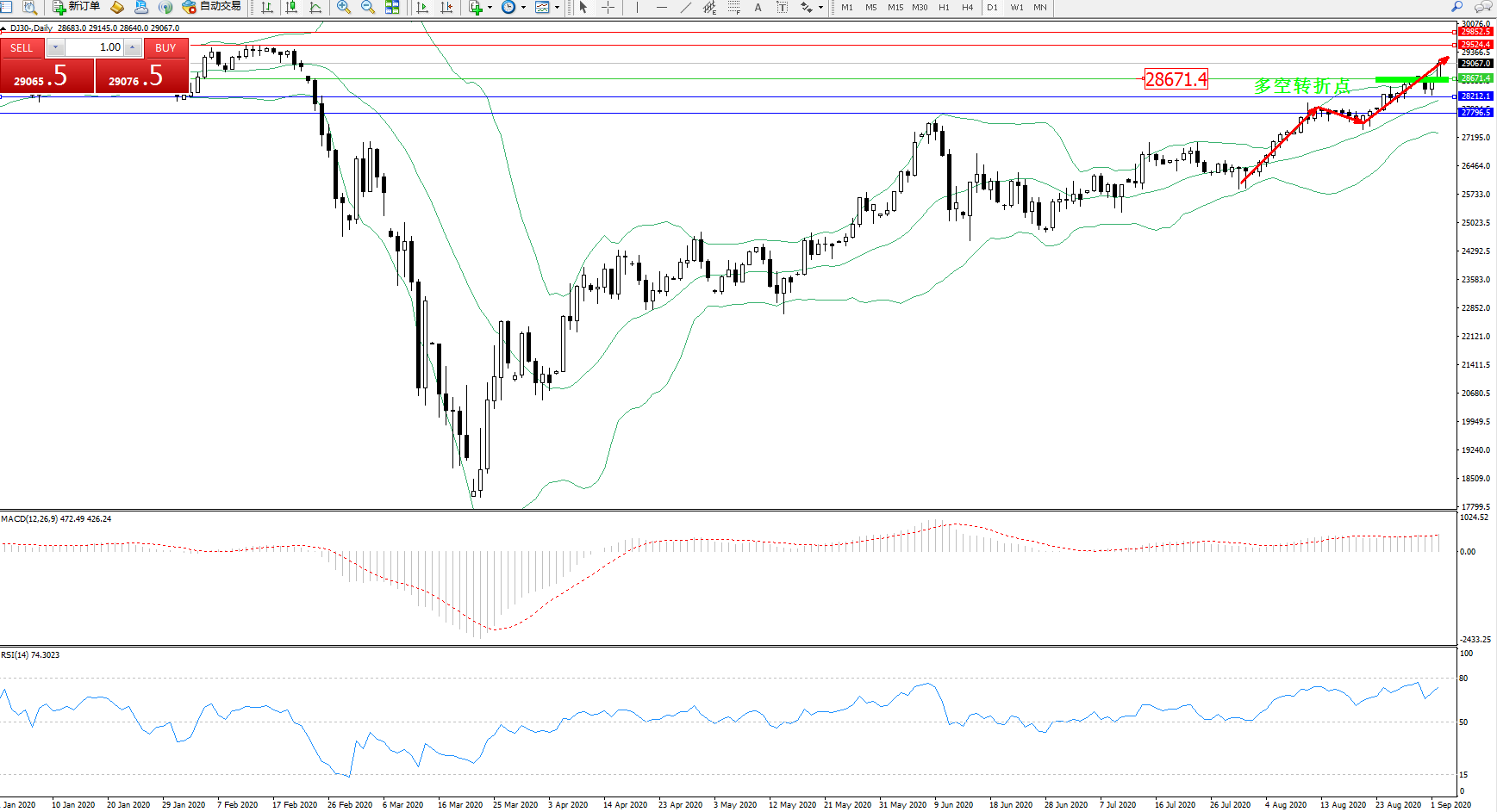 道琼斯指数9月2日(周三)收盘上涨454.80点,涨幅1.59%,报29100.50点。隔夜美国股市收涨,特朗普恢复成为赢得美国大选的热门人选,随着美国大选选情进一步明朗,资金可能变本加厉回流美国市场。美国8月ADP就业人数录得增加42.8万人,创有记录以来的第三大增幅,但大幅不及预期的100万人,前值为16.7万。随着美国股市持续刷新历史高位,许多投资者的注意力正转向11月大选带来的风险。上周美联储主席鲍威尔的讲话被市场认为其仍然处在相当鸽派的状态。美联储的通胀目标是随着时间推移能实现平均2%的目标。这意味着在加息之前,美国通胀将能够被容忍维持在2%上方。美联储总是在失业率开始下降的时候寻求降息,因为这意味着通胀即将到来;美国经济迫切需要额外的财政刺激措施,以从Covid-19危机中全面反弹。尽管美国正在从停工中恢复过来,并且就业机会正在恢复,但部分经济仍需要额外的支持。