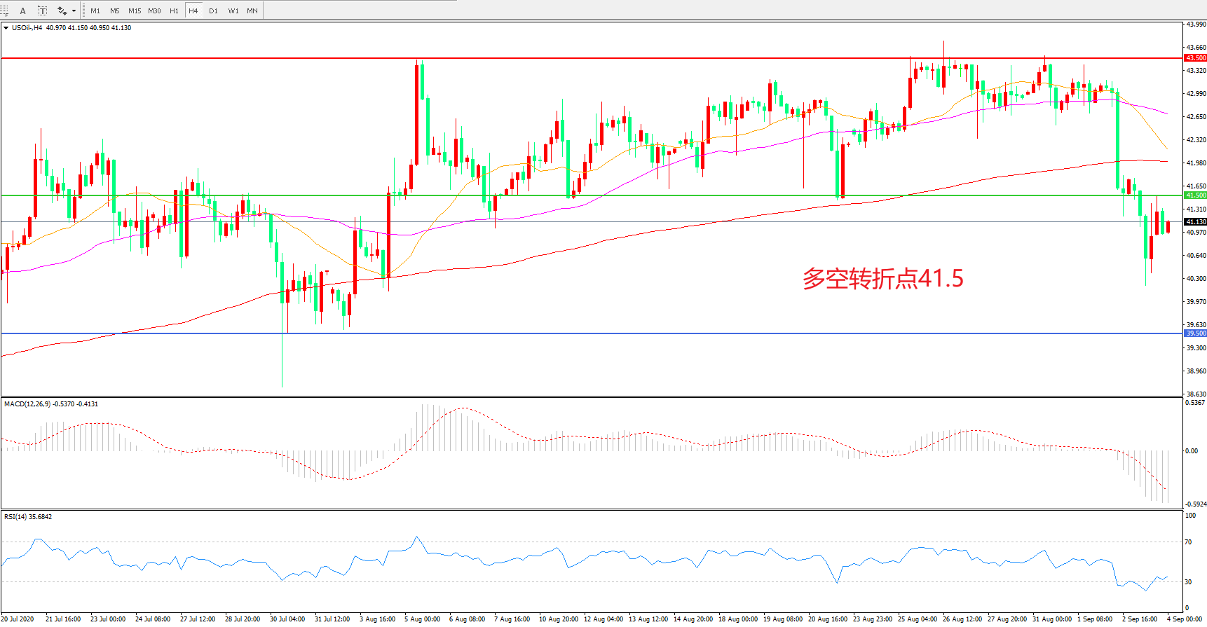 周四(9月3日),受美股暴跌影响,市场风险情绪回落,美国WTI原油破位下行,收报41.07美元/桶。目前来看,油价的走势与美股稍微有些分化,节奏上略显不同步,但整体的方向似乎都是一致的,原油市场中的宏观资金可能先于股市退出了市场,导致昨日油价波幅巨大。
