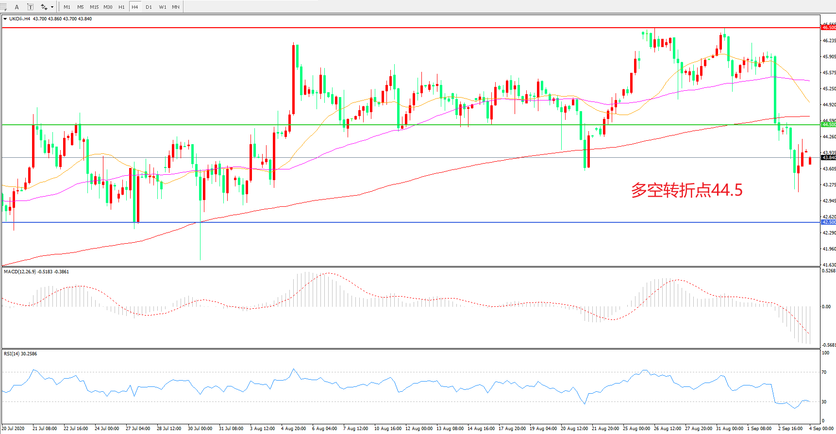 周四(9月3日),受美股暴跌影响,市场风险情绪回落,布伦特原油破位下行,收报43.97美元/桶。目前来看,油价的走势与美股稍微有些分化,节奏上略显不同步,但整体的方向似乎都是一致的,原油市场中的宏观资金可能先于股市退出了市场,导致昨日油价波幅巨大。