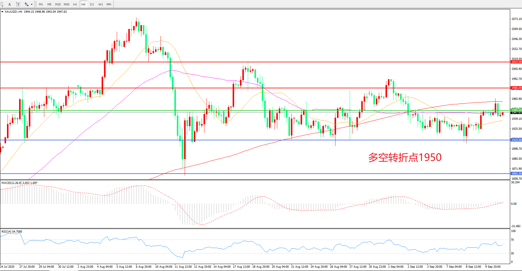 4小时图看,金价冲高回落,短期涨势放缓,但价格运行中枢逐渐抬高,1950成为多空分水岭,均线系统走平,MACD红柱增加,RSI指标走平,日内延续震荡概率较大。