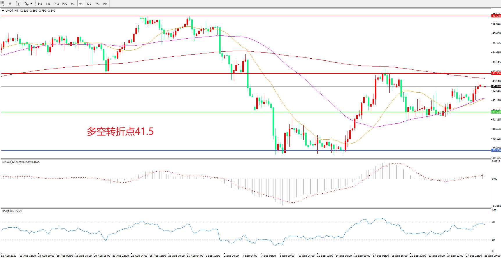 4小时图看,油价以41.5美元为依托震荡反弹,短期走势有所回暖,200均线成为上方主要压力,MACD红柱增加,RSI指标走平,日内延续震荡概率较大。