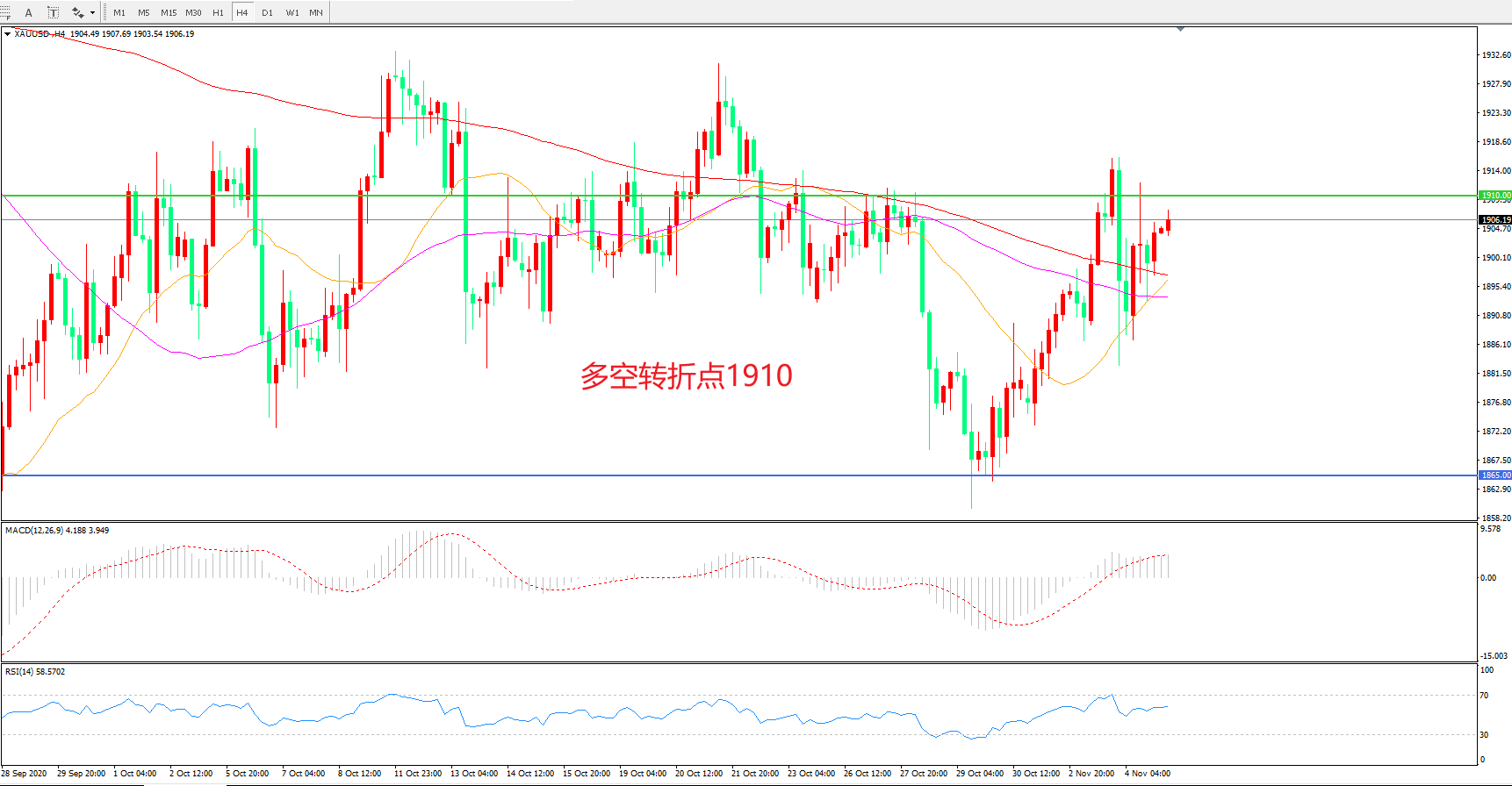 4小时图看,金价自低位连续拉升,整体表现偏强,均线阻力成为下方支撑,1910成为短期多空分水岭, MACD红柱增加,RSI指标走平,日内延续上行概率较大。