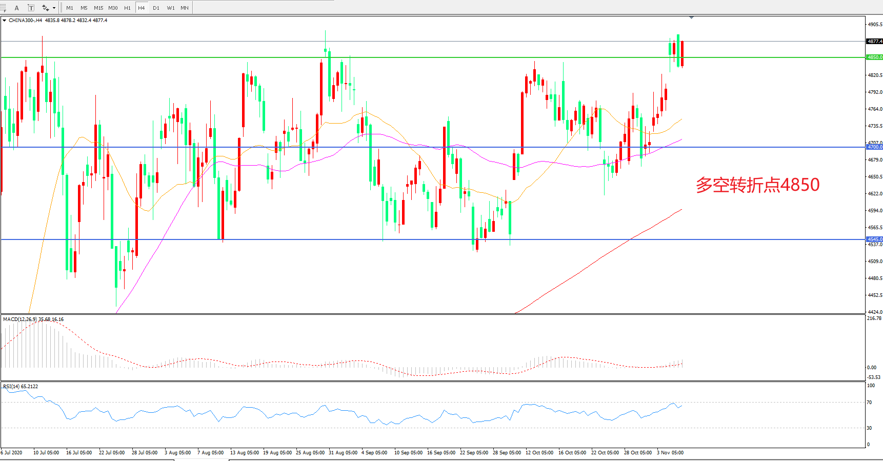 4小时图看,沪深300震荡上行,短期走势有所回暖,均线系统拐头向上,MACD红柱增加,RSI指标向上,日内延续上行概率较大。