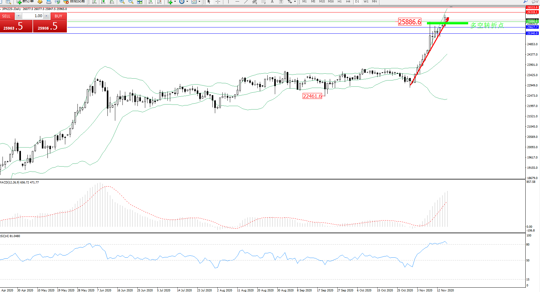 日经225指数11月17日(周二)收盘上涨100.57点,涨幅0.39%,报26007.50点。投资者当前面对疫苗进展消息已经理智了许多,消息在经过咀嚼之后的影响力持续性也已经显著衰退,大家都已经开始直面现实,即使疫苗被证实有效并全面推广,对已经严重受损的美欧经济也只是亡羊补牢的效果,全球资本依然会选择东移至亚太市场,日本央行提出在未来直接买入1万亿日元,并提供美元基金集合抵押品。尽管日本三季度GDP数据非常亮眼,但日本仍然难以摆脱经济衰退的现实问题。虽然负利率形势下持有日经济是件令人头疼的事,但是随着全球利率追上日本的脚步,日益逼近零甚至变成负值,这样的头疼如今已经不是那么严重了。