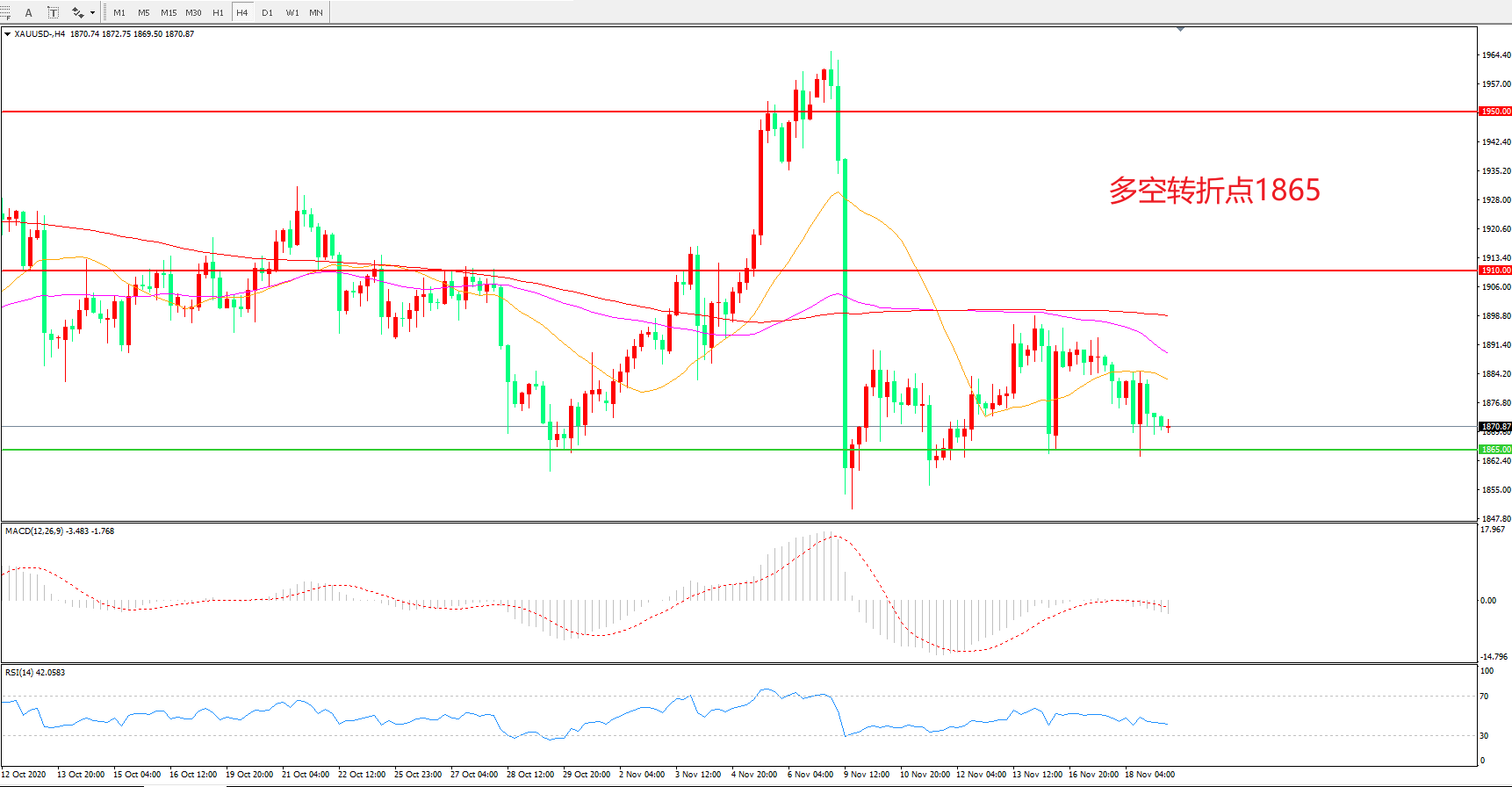 周三(11月18日)美国辉瑞制药宣布,其疫苗在临床试验的最终数据分析中有效率达到95%,已经满足申请紧急使用授权的要求,金价出现短线下挫,但跌势不大,仅有十几美元,且很快反弹,现货黄金延续低位震荡收报1871.84美元/盎司。