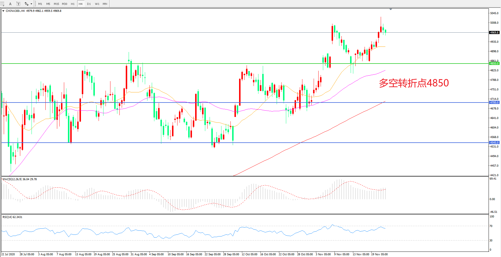 4小时图看,沪深300冲高回落,高位震荡趋势较为明显,21周期均线成为短期支撑,5000成为短期阻力,MACD红柱增加,RSI指标向上,日内延续上行概率较大。