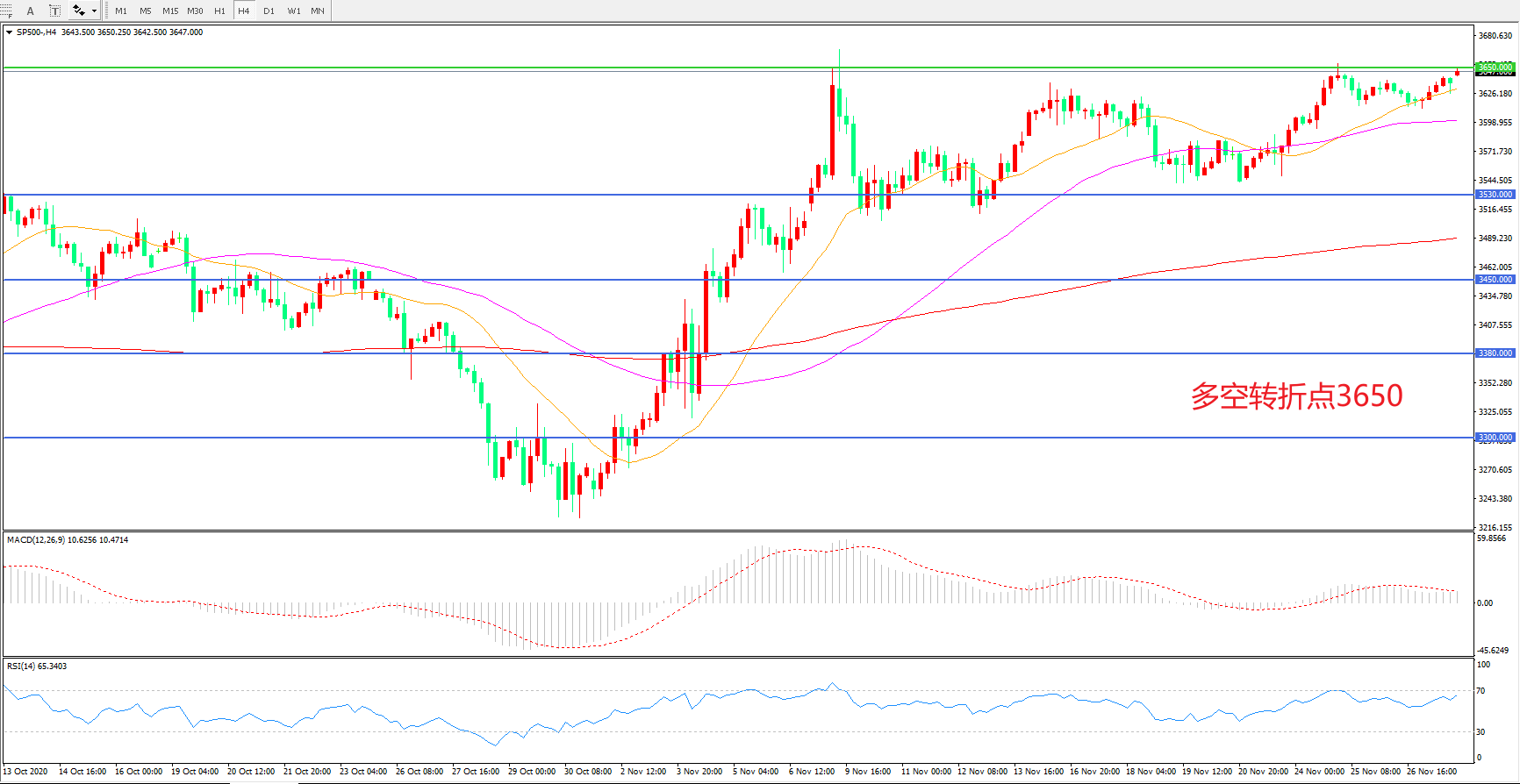 周五(11月27日),随着美国总统选举结果的不确定性消散,疫苗研发利好提振了投资者信心,美股延续强势表现,标普500震荡上行,收报3636.75点。科技、芯片等市值高的龙头股起拉动作用,中概股中拼多多涨幅达到6%。目前与疫苗/复苏有关的很多乐观情绪已经反映在股价中了,但疫苗接种相关风险、财政刺激计划推迟和更长时间的停摆都是市场中的隐忧。