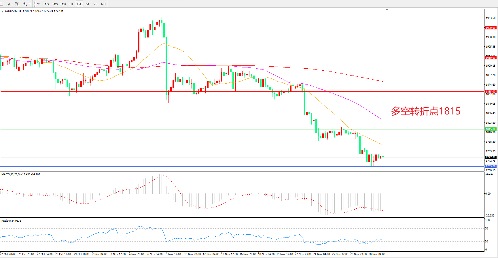 周二(12月1日),美国参议院两党小组提出规模9080亿美元的经济刺激计划,美联储主席鲍威尔出席参议院听证,与财长姆努钦讨论新冠肺炎援助法案的事宜,美元指数遭遇重挫,跌至两年半低点,现货黄金暴力反弹近40美元,收报1812.72美元/盎司。