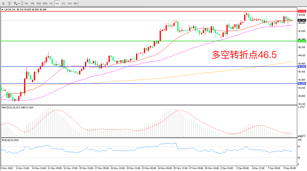 4小时图看,油价延续高位震荡,短期波幅不大,55周期均线成为短期支撑,50美元成为中期阻力,MACD红柱减少,RSI指标走平,日内延续震荡概率较大。