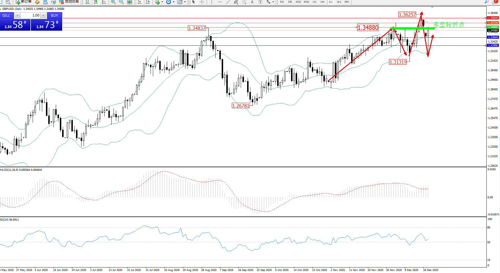 交易策略:1.34880下方看跌,目标1.33849、1.32990