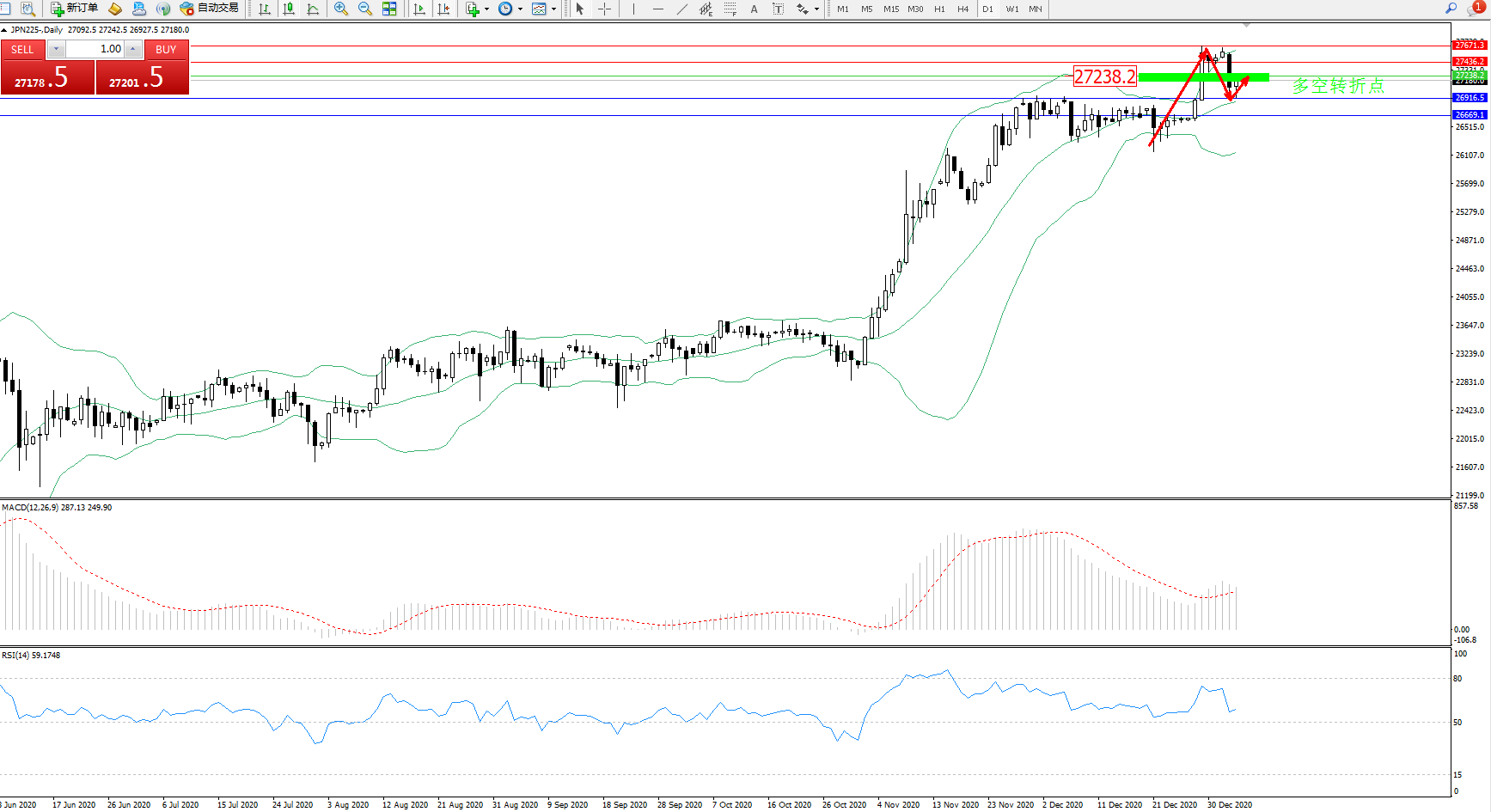 日经225指数1月5日(周二)收盘下跌112.38点,跌幅0.41%,报27146.00点。据日本朝日电视台:日本东京新增1278例新冠肺炎确诊病例,累计达64752例。神奈川县新增622例新冠肺炎确诊病例。日本兵库县新增222例新冠肺炎确诊病例。日本政府正考虑再次针对东京及周边地区宣布紧急事态宣言。同时,日本政府还拟叫停目前仍保留的,与11个国家和地区的商务人士往来快捷通道。如果这一通道被叫停,也意味着外国人入境日本的渠道将暂时全面中断。日本将实质上暂时进入“锁国”状态。日本首相菅义伟在自民党高层会议上透露,关于因新冠疫情蔓延而向东京都和埼玉、千叶、神奈川3县再次发布紧急事态宣言,拟于7日决定下令。他表示,预计在7日或8日发布宣言,正在协调把时间定为1个月左右。宣言在鉴于专家组成的咨询委员会的意见、由首相做出综合判断后,将明示持续时间和对象地区进行发布。