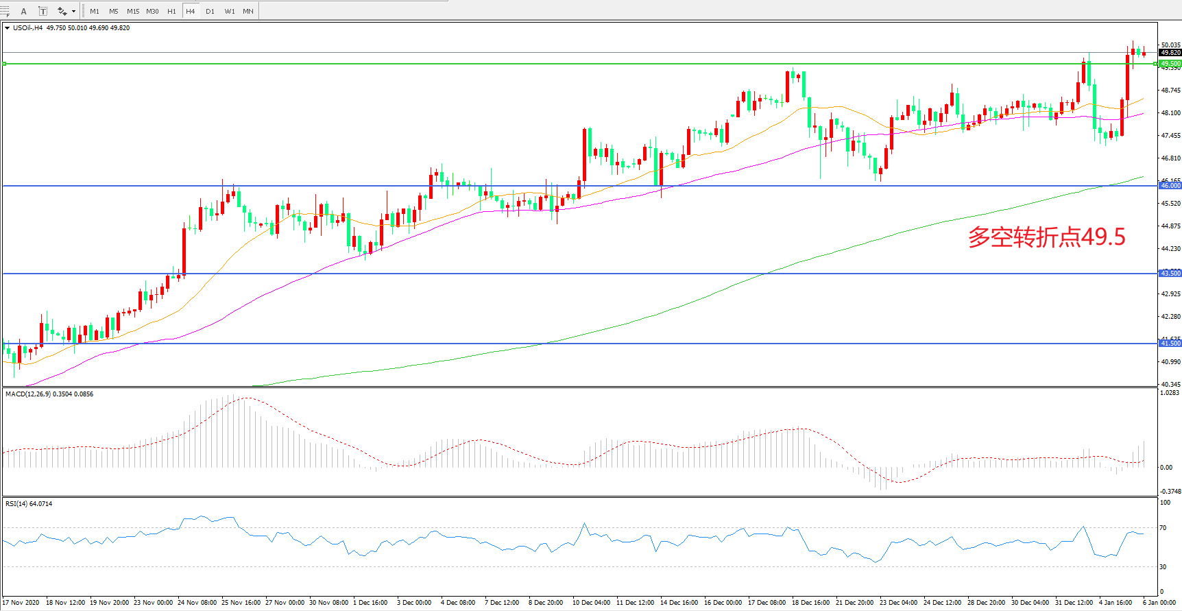 4小时图看,油价长阳拉升,前期跌幅被全部收复,短期走势偏强,49.5成为短期多空分水岭,均线系统走平,MACD红柱增加,RSI指标走平,日内震荡上行概率较大。