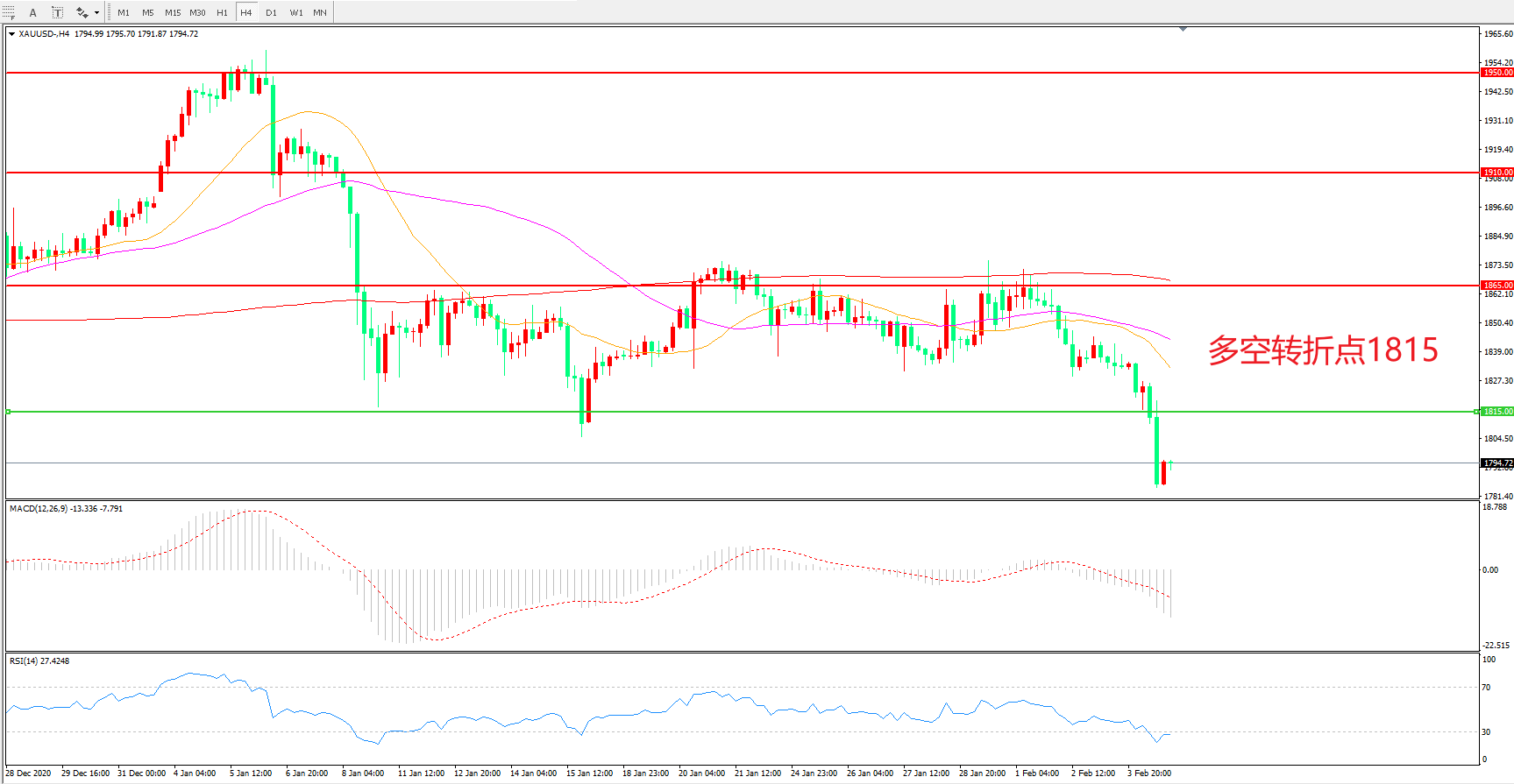 周四(2月4日),美国当周初请失业金人数为自11月28日以来最少,表明美国经济继续从新冠疫情下缓慢复苏,美元指数升至一个多月以来最高点,现货黄金遭遇暴跌,破位下行后收报1793.54美元/盎司。在1月非农报告公布之前,周三公布的ADP就业数据和周四公布的上周初请失业金数据都表现良好,增加了市场对非农报告的乐观预期,晚间非农数据如能保持一致,金价可能迎来更大幅度的下跌,务必重点关注。